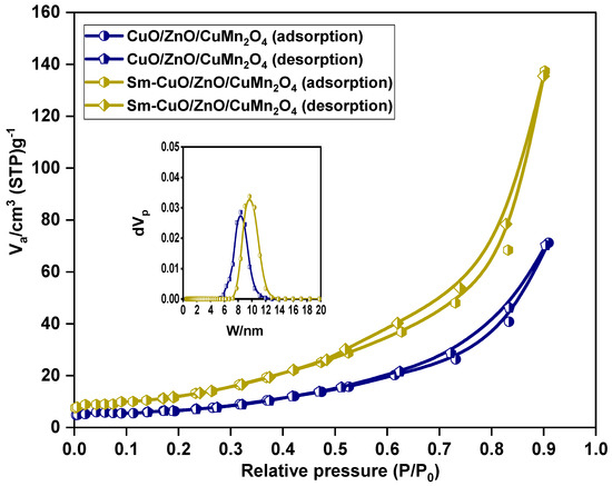 BET surface area of pure and Sm-doped CuO/ZnO/CuMn2O4 tri-composites, with inset pore size distribution.