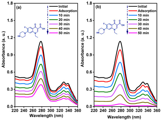 Time-dependent UV–visible absorption spectra of norfloxacin solution for (a) CuO/ZnO/CuMn2O4 and (b) Sm-doped CuO/ZnO/CuMn2O4 ternary composites.