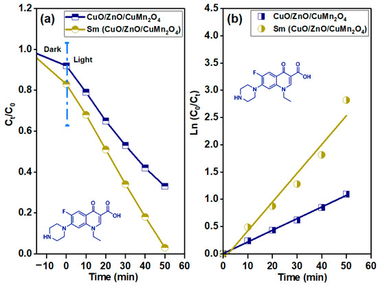 In this formulation, C0 and Ct represent the concentration of the norfloxacin at time (t) = zero and at different irradiation times (min), respectively, while k signifies the apparent rate constant (min−1) of the photodegradation reaction. Figure 10b shows the linear fitting relationship between ln(C0/Ct) and the time (min) for both catalysts. Remarkably, the photodegradation apparent rate constant (k) of the Sm-doped CuO/ZnO/CuMn2O4 catalyst (0.053 min−1) is significantly higher than that of the pure CuO/ZnO/CuMn2O4 tri-composite (0.021 min−1).