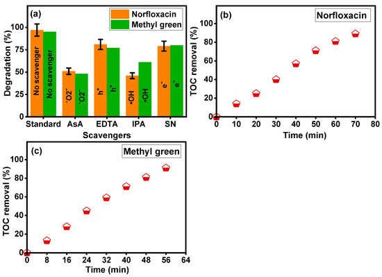 (a) Detection of main radicals by using different scavengers, (b) TOC analysis for norfloxacin, and (c) TOC analysis for methyl green dye of Sm-doped CuO/ZnO/CuMn2O4 catalyst.