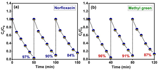 Reusability of Sm-doped CuO/ZnO/CuMn2O4 catalyst for (a) norfloxacin and (b) methyl green dye.