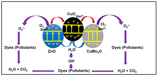 The stability of the catalyst after several uses is an essential factor for the actual photocatalytic applications. Figure 13a,b shows the obtained results for the photodegradation reaction of the Sm-doped CuO/ZnO/CuMn2O4 photocatalyst for three cycles against norfloxacin and methyl green pollutants, respectively. The measured reusability efficiency indicated that the Sm-doped CuO/ZnO/CuMn2O4 photocatalyst has a photodegradation value of 97, 90, and 84% for the norfloxacin compound while for methyl green, the activity was estimated to be 96, 91, and 87% during the three cycles, respectively. The integration factors point out that the Sm-doped CuO/ZnO/CuMn2O4 ternary composite is a promising photocatalyst for the removal of organic pollutants with high mineralization efficiency and stability. The obtained results for the photodegradation properties of Sm-doped CuO/ZnO/CuMn2O4 photocatalyst were compared with previously published studies as reported in Table 2. The comparison reflects the high efficiency of the Sm-doped CuO/ZnO/CuMn2O4 photocatalyst towards organic pollutants degradation. As shown in Figure 14, the complete mechanistic picture of the photodegradation reaction of norfloxacin and methyl green molecules in the presence of the Sm-doped CuO/ZnO/CuMn2O4 photocatalyst under sunlight radiation can be explained based on scavenger tests and total organic carbon analysis. When Sm-doped CuO/ZnO/CuMn2O4 particles are exposed to solar light energy, electron-excitation happens, leading to the production of an electron–hole pair (e−-h+) as photoexcited charge carriers. The charge separation takes place between the different components through transfer of the electron from the p-type CuO to n-type ZnO or CuMn2O4, while the holes transfer in the opposite direction. Then, the h+ and e− interact with the water (H2O) and oxygen (O2) molecules to form ·OH and ˙O2− radicals, respectively [42,43]. Both OH and ˙O2− radicals attack the norfloxacin and methyl green molecules and mineralize them as shown below:
