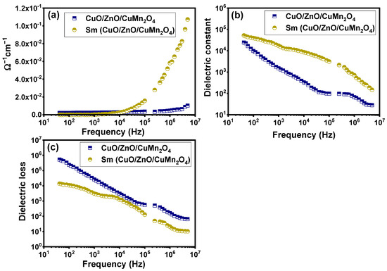 Dependency of (a) ac electrical conductivity, (b) dielectric constant, and (c) dielectric loss on frequency for pure and Sm-doped CuO/ZnO/CuMn2O4 ternary composites.