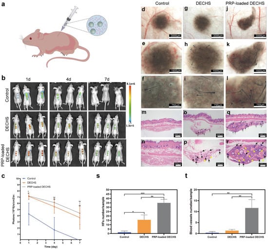Figure 1. PRP-loaded DECHS improves the HF inductive ability. (a) Schematic diagram of injecting PRP-loaded DECHS into a nude mouse; (b) in vivo fluorescence imaging following subcutaneous injection of DIO-labeled cells in the control group, DECHS group, and PRP-loaded DECHS group. (c) Quantitative diagram of the DIO signal intensity expressed as photons/s/cm2/sr. Stereomicroscopy images of injection sites in the control group (df), DECHS group (gi), and PRP-loaded DECHS group (jl). HE-stained images of the injection site in the control group (m,n), DECHS group (o,p), and PRP-loaded DECHS group (q,r). Black arrows: regenerative HFs, yellow: regenerative blood vessels. Statistical diagrams of HF numbers/sample (s); and blood vessel numbers/sample (t) among the three groups. * p < 0.05; ** p < 0.01; *** p < 0.001; statistical significance was analyzed using unpaired independent-samples t-test [4].