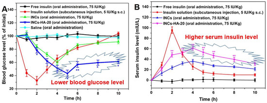 Figure 2. Blood glucose levels in diabetic rats following oral administration of insulin-loaded nanocarriers, HA hydrogel system containing insulin-loaded nanocarriers, saline, and insulin solution (A). Serum insulin level in diabetic rats following oral administration of insulin-loaded nanocarriers, HA hydrogel system containing insulin-loaded nanocarriers, and insulin solution (B). Data are presented as the average ± standard deviation (n = 5, * p < 0.05, ** p < 0.01) [19].