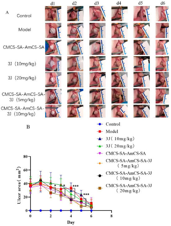Innovations in hydrogel composites extend to the treatment of oral ulcers, with the design of an intelligent composite hydrogel supported with compound 3J. This hydrogel formulated using sodium alginate, carboxymethyl chitosan, and chitosan quaternary ammonium salt, demonstrated significant anti-inflammatory activity and pH sensitivity. These characteristics are particularly beneficial for oral ulcer treatments, offering a responsive approach to therapy that can potentially improve patient outcomes [35]. Figure 3 demonstrates the efficacy of CMCS-SA-AmCS-SA and 3J on oral ulcer healing in vivo. Over time, the ulcer area decreased in all groups. However, CMCS-SA-AmCS-SA hydrogel and CMCS-SA-AmCS-SA-3J (20 kg/mg) hydrogel exhibited superior therapeutic effects compared to other groups.