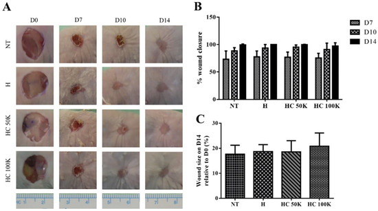 Figure 4. Wound closure and wound contraction. (A) Representative visual appearance of the wound for different treatment groups on day 0, 7, 10, and 14; (B) percentage wound closure for different treatment groups on day 7, 10, and 14 (p > 0.05); and (C) wound size, i.e., wound contraction on day 14 relative to day 0 (p > 0.05). (NT) stands for no treatment group; (H) hydrogel alone, HC 50 K and HC 100 K stands for hydrogel with different amount of HDF [92].