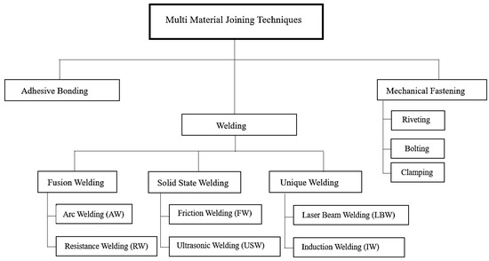 The other permanent joint option is welding, which can be divided into fusion welding and solid-state welding. Fusion welding, for example, resistance spot welding (RSW), arc welding (AW), and Resistance Seam Welding (RSSEW), involves the faying surfaces of base metals being fused through heating them to their melting points so that they coalesce during welding. Solid-state welding, such as Friction Welding (FW) and ultrasonic spot welding (USW), involves joining the faying surfaces of base metals without heating them to their melting points. There are other welding processes that do not fall into either of the above categories, namely Laser Beam Welding (LBW) and Induction Welding (IW). Unlike joining using mechanical fasteners and adhesive bonding, welding has a limited ability in joining dissimilar metals and metal–polymer combinations. This is due to the joining mechanism involved, i.e., heating or melting workpieces with differences in their thermal conductivity and coefficients of thermal expansion [23]. Furthermore, during the solidification of the weld joints, intermetallic compounds (IMCs) that are brittle, their porosities, and dendritic recrystallization will affect the integrity of the weld quality [24]. Even though mechanical fasteners and adhesive bonding are suitable for dissimilar and composite materials [18], the welding process, despite the above-mentioned limitations, is more suitable for process automation and faster process.