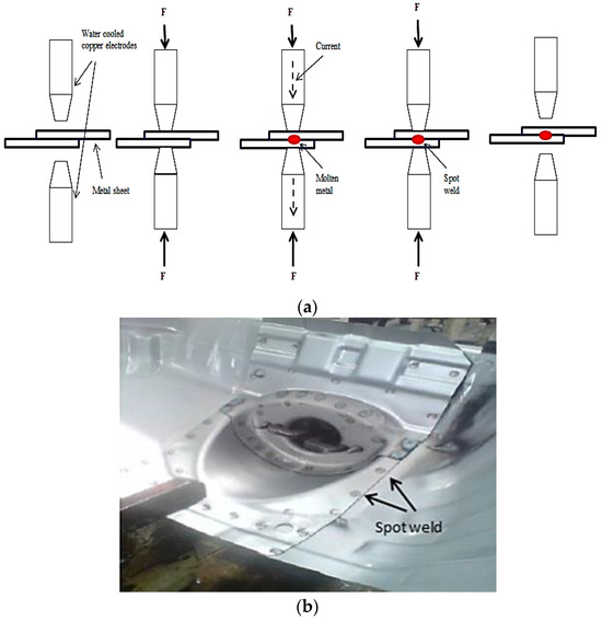 Spot-welded joints are the most common joints used in automotive industries. An automotive BiW generally will have around 2000–5000 spot welds [25,26]. Traditionally, in automotive BiWs, where they have been predominantly built using steel sheets, the resistance spot welding (RSW) process has been the preferred choice due to its inherent characteristics, such as its low cost, as no filler is required for this process, unlike the arc welding process; fast operation; and ease of being automated using robots [27,28,29]. However, when the concept of lightweight vehicles was introduced and multi-material design was incorporated, aluminum, magnesium, and carbon-fiber-reinforced polymers (CFRPs) were spot-welded with steel. RSW uses a material’s electrical resistance to generate heat at the faying surfaces of the metals to be joined. Non-ferrous metals such as aluminum, copper, and magnesium have very high thermal and electrical conductivities compared to steel; therefore, concentrating the heat at the faying surfaces for metal melting to happen is difficult. Hence, joining these materials with steel using RSW has been challenging [30,31,32]. Welding aluminum with steel to form a dissimilar joint causes electrode deterioration and high energy consumption [33]. RSW has not been able to join CFRPs with metal, as the former are insulators [34].