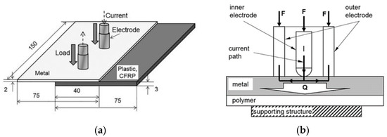 Variants of RSW that use Joule heating to form spot welds in composite joints involve either a change in the electrode arrangement or the electrode design [34,35,36,37], the use of separate metallic elements at the faying surfaces [43,44,45,46,47,48,53], or the use of additional elements, such as permanent magnets, induction coils, and shunt tools, for heat generation and transfer [50,51,52].