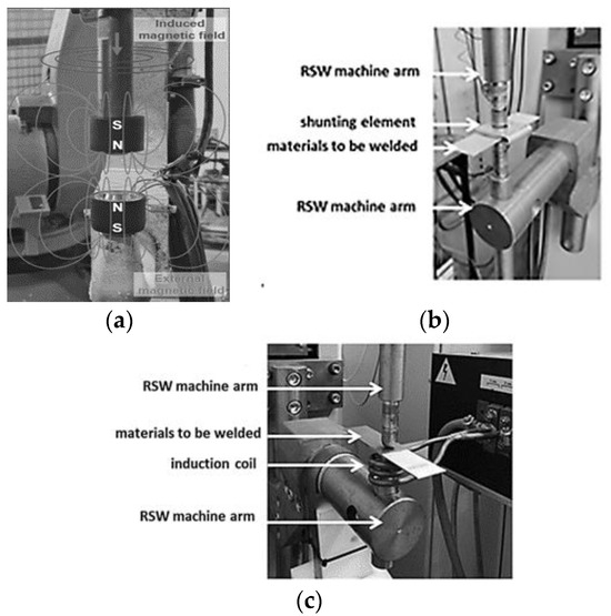 (a) Magnetically assisted resistance spot welding (MA-RSW), (b) shunt current-assisted resistance spot welding (SCA-RSW), and (c) induction heat-assisted resistance spot welding (IHA-RSW) [50,51].
