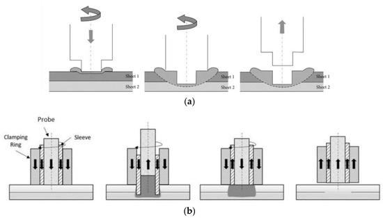 (a) Friction stir spot welding (FSSW) process [55] and (b) refill friction stir spot welding (refill FSSW) process [57].