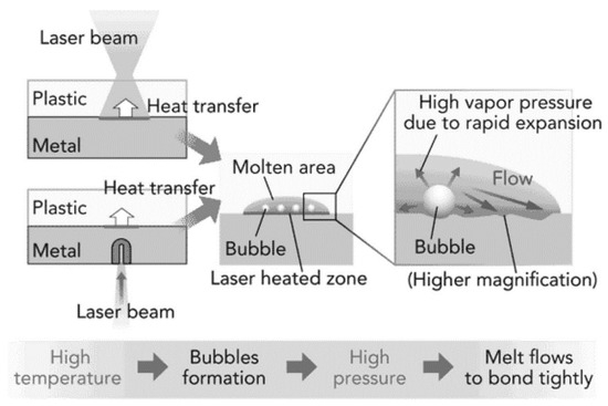 - Huang, Y.; Gao, X.; Ma, B.; Zhang, Y. Interface formation and bonding mechanisms of laser welding of pmma plastic and 304 austenitic stainless steel. Metals 2021, 11, 1495. [Google Scholar] [CrossRef]