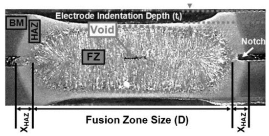 The welding parameters for RSW are current, time, and electrode force. A higher current and longer weld time have been recommended to achieve an acceptable weld nugget diameter [49]. There is a positive correlation of the molten zone depth with the welding current and time and a negative correlation with the weld force [37]. The conventional resistance spot welding (RSW) spot weld morphology for metal–metal joints consists of three distinct regions, the fusion zone (FZ), the heat-affected zone (HAZ), and the base metals (BMs), as shown in Figure 11. The FZ is the weld nugget that is produced due to the melting and re-solidification of the base metals. The HAZ is the area that does not melt but undergoes microstructural changes due to the heat at the adjacent FZ. In RSW of metal–polymer composite joints, as heat flows from the metal to the polymer due to the thermal conduction in a series electrode arrangement and coaxially arranged electrodes, the molten region or the FZ is observed on the polymer side, as in Figure 12. The spot weld morphology for series electrodes also shows the extrusion of the top metal sheet into the lower polymer sheet, as in Figure 13, due to the electrode’s indentation on the metal side. For coaxial electrodes, the FZ is in between the inner and outer electrodes; hence, the spot welds in Figure 13 did not have the conventional lens shape shown in Figure 11. Unlike the weld nuggets in metal–metal joints, which are created through melting and solidification, metal–polymer weld nuggets are formed due mechanical interlocking or chemical bonding.