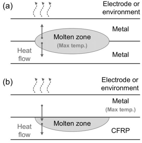 - Ren, S.; Ma, Y.; Ma, N.; Saeki, S.; Iwamoto, Y. 3-D modelling of the coaxial one-side resistance spot welding of AL5052/CFRP dissimilar material. J. Manuf. Process. 2021, 68, 940–950. [Google Scholar] [CrossRef]