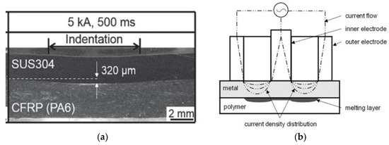 Contrary to the traditional RSW setup, two electrodes (+ve and −ve electrodes) were placed in series on the metal side, as in Figure 4, to form a composite spot weld joint between austenitic stainless steel (SUS304) and carbon-fiber-reinforced thermoplastic (CFRTP) [35]. The joints were produced by current flowing only on the metal side. This current generated heat that melted the CFRTP at the faying surfaces through heat conduction, thus producing a joint between SUS304 and the CFRP. The joint constituents depend on the materials joined. The bonding mechanism involves van der Waal forces and the hydrogen bonds formed between the metal oxide and the polar functional groups of the CFRP. Surface treatment of the stainless steel enhanced the joint strength. It was reported that SUS304 and the polyphenylene-sulphide-based CFRP (PPS) did not produce a bond, as the CFRP (PPS) is nonpolar, and only van der Waal forces were formed at the faying surface [35].