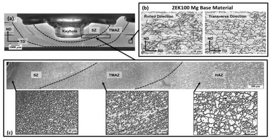 Macrograph showing various microstructural zones of conventional FSSW: (a) transverse cross-section, (b) base metal, (c) microstructural features in the SZ, TMAZ, and HAZ [135].