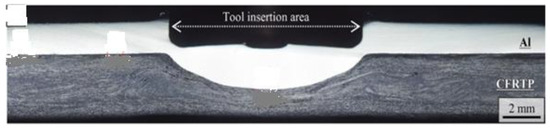 In the joining of aluminum Al with the CFRTP, the tool plunge creates a keyhole on the aluminum side, and a joint is formed due to the mechanical interlocking of the melted CFRTP with the Al alloy, as shown in Figure 16 [136,137]. The materials are mixed due to the stirring in the stir zone [131]. Figure 17 shows the bond that is formed via the mechanical interlocking between the aluminum and the CFRP, with the aluminum protruding into the carbon fiber–polyphenylene sulfide (CF-PPS).