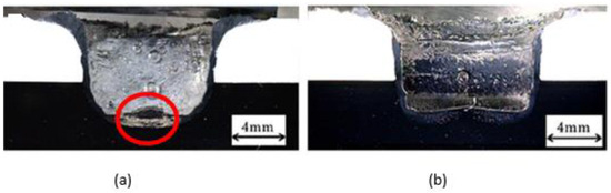 (a) Cross-section of FSSW PVC joint with SiC particles in the middle section of SZ (red circle) and (b) cross-section of FSSW PVC joint without SiC particles [139].