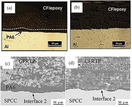 - Wang, T.; Yasuda, K.; Nishikawa, H. Study on the SPCC and CFRTP Hybrid Joint Performance Produced with Additional Nylon-6 Interlayer by Ultrasonic Plastic Welding. Polymers 2022, 14, 5235. [Google Scholar] [CrossRef] [PubMed]