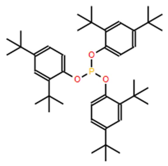 Molecular structure of the antioxidant additive Irgafos P-168.