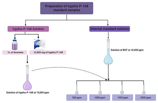 Figure 2 shows how a stock solution of Irgafos P-168 at 10,000 ppm was prepared (by adding 10,000 mg of Irgafos P-168 in 1 L of Limonene) and an internal standard solution of butylated hydroxytoluene (BHT) at a concentration of 10,000 ppm. These solutions generated four samples with known concentrations of 500, 1000, 1500, and 2000 ppm.