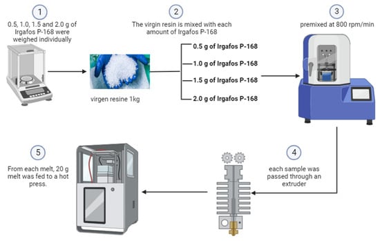 The C-PP/PE samples with Irgafos P-168 were prepared following the procedure described in Figure 3, which had the following stages: (1) 0.0, 0.5, 1, 1.5, and 2.0 g of Irgafos P-168 were weighed in quantities individually. (2) To each of the quantities of Irgafos P-168, 1 kg of virgin C-PP/PE resin was added. (3) Mixtures were premixed with a standard Prodex mixer, Henschel 115JSS, at 800 rpm for 7 min. (4) Next, each sample was mixed with a Welex-200 24.1 extruder equipped with five temperature zones in its path. The temperatures used were 190, 195, 200, 210, 210, and 220 °C. This process guaranteed uniform distribution of the mixture. (5) Finally, from each type of melt, 20 g of mass was fed into a CARVER 3895 hot press. In this CARVER machine, the samples were compressed until films 300 mm in diameter with a thickness of ≈100 μm were obtained. The resulting films in the experiment were identified as C-PP/PE (0 ppm of Irgafos P-168), C-PP/PE 2 (500 ppm of Irgafos P-168), C-PP/PE 3 (1000 ppm of Irgafos P-168), C-PP/PE 4 (1500 ppm of Irgafos P-168), and C-PP/PE 5 (2000 ppm of Irgafos P-168).