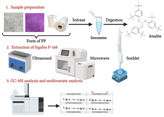 Unfortunately, the use of green solvents is still limited in the polymer industry for the extraction of additives such as Irgafos P-168, so in this research, extraction techniques assisted by microwaves, ultrasound, and Soxhlet will be used, using a method-sensitive microextraction coupled to gas chromatography, for the simultaneous determination of the concentration of Irgafos P-168 and degradation products in C-PP/PE samples. Three pretreatments of PP (ground, pellets, and films) will be carried out using a traditional solvent (dichloromethane) and a green solvent (Limonene). Multivariate analysis will evaluate performance, and the degradation products of Irgafos P-168 will be quantified to establish their relationship with the results of each extraction. The results of this research are essential to the scientific community, industry, and regulatory bodies involved in the extraction and characterization of Irgafos P-168 in polymeric matrices.