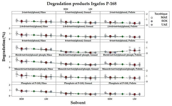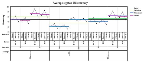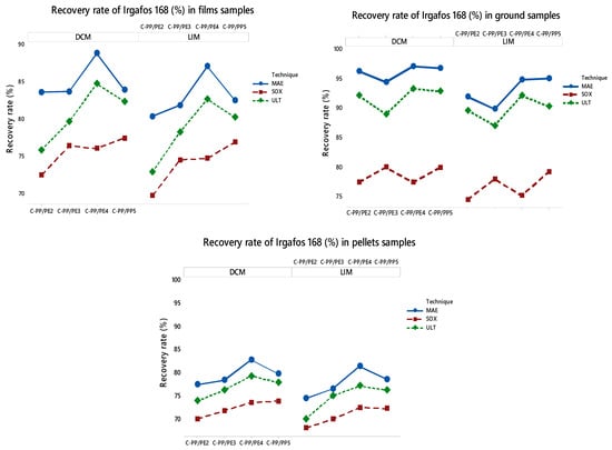 Multiple extraction techniques were used to evaluate the recovery of Irgafos P-168, including Soxhlet, ultrasound, and microwave, along with two different solvents, dichloromethane, and Limonene. In addition, different forms of C-PP/PE were worked with, that is, ground, pellets, and film, and the extraction times were varied. To analyze the results effectively, a variability graph was constructed that allowed the identification of differences in the means and variations in antioxidant recovery at the combined levels (Figure 6).