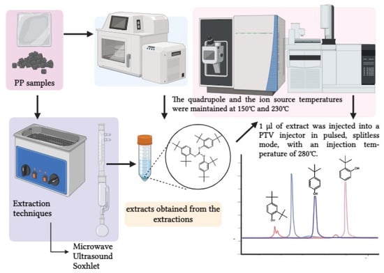 Figure 4 presents the methodology used in this research to extract Irgafos P-168 from C-PP/PE samples in ground form, pellets, and films, to which Irgafos P-168 had been added. Solid–liquid extractions were carried out using two different solvents, dichloromethane and Limonene. These extractions were performed using three methods: Soxhlet, ultrasound (conventional laboratory sonic bath), and microwave oven (high-power programmable laboratory microwave oven), and a mass-coupled gas chromatograph was used to quantify the concentration of Irgafos P-168 and the degradation products present in the C-PP/PE film samples. In preliminary tests, it was identified that 90, 50, and 117 °C were the optimal temperatures for working with Soxhlet, ultrasound, and microwave, respectively. Therefore, this variable was left fixed in our experimental design, and thus, we could evaluate how other variables affect the extraction efficiency.