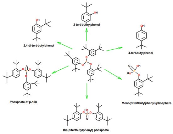 An illustration is provided in Figure 8 to clarify the degradation processes, showing how the breaking of the (PO) bond and the tert-butyl methyl diphenyl groups complicates the complete recovery of Irgafos P-168. This difficulty arises because a part of the molecule is lost due to fragmentation, leading to the formation of molecules with properties different from the original antioxidant. Additionally, Table 2 presents a detailed profile of the degradation of Irgafos P-168. This profile includes the recovery percentage of each compound obtained through the fragmentation of the crucial bonds present in the compound’s structure. This detailed information provides a more comprehensive view of the resulting degradation products and their respective recovery rates, contributing to a deeper understanding of the effects of degradation on the original compound.