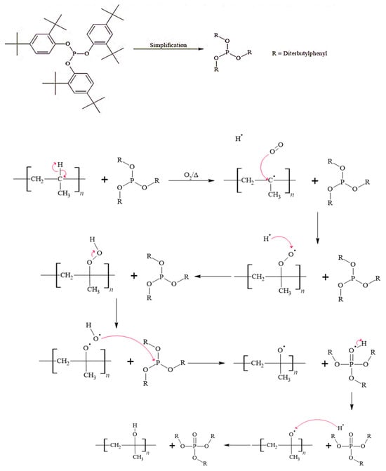 In Figure 8, the mechanism carried out in the first two stages involves the typical steps of all the other degradation products since they show how the hydrogen radicals that cause the degradation of Irgafos P-168 are formed. The first thing that occurs is a homolytic cleavage in the tertiary carbon of C-PP/PE caused by temperature and the presence of the peroxide bond (OO), so said carbon undergoes oxidation, and at the same time, the hydrogen radical (H·) returns to stabilize by uniting this time with oxygen. Subsequently, a homolytic cleavage occurs again between the peroxo bond (OO), which on this occasion generates a hydroxyl radical (OH·) that attacks the phosphorus of Irgafos P-168, generating a double bond with it once again. It generates homolytic cleavage by hydrogen, stabilizing the polymer chain’s carbon.