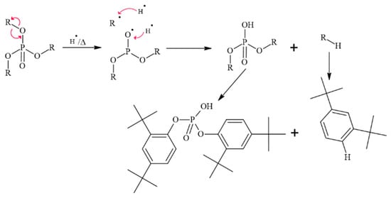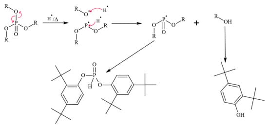 Based on the results obtained previously, we present the possible mechanisms of the degradation of Irgafos P-168 in Figure 9, Figure 10, Figure 11, Figure 12, Figure 13 and Figure 14, which exhibit the formation processes of each of the products resulting from the thermo-oxidative degradation. All these mechanisms share the characteristic of developing in conditions that involve the presence of hydrogen and oxygen radicals in abundance, which occur in the tertiary carbons present in the polypropylene structure [,,].