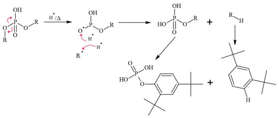 In Figure 12, the formation mechanism begins from the previous product Bis(di-tert-butylphenyl) phosphate; in the presence of the hydrogen radical and high temperature, a homolytic cleavage occurs between the C of the R group and the oxygen, releasing another R group, both of which are stabilized with hydrogen radicals. The degradation product of interest and a di-tert-butylphenyl are obtained.