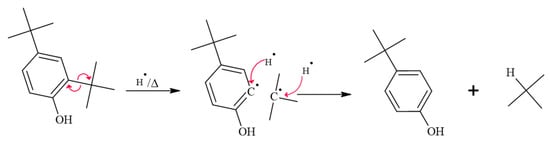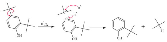 The last mechanism illustrated in Figure 14 for the formation of the 4-tert-butylphenol product involves the loss of a tert-butyl group in the (ortho) position, so it begins with the 2,4-tert-butylphenol molecule, which undergoes a homolytic cleavage between the ring carbon bond and the tert-butyl carbon, resulting in the product of interest 4-tert-butylphenol and a tert-butyl group.