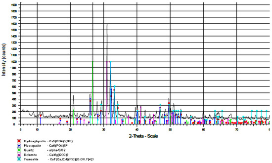 X-ray studies of the phase composition of the phosphorite ore fines samples were performed using an X-ray diffractometer “Bruker AXS” (Germany). The diffractogram of the phosphorite ore fines and instrument printouts of crystalline phases have been shown in Figure 3.