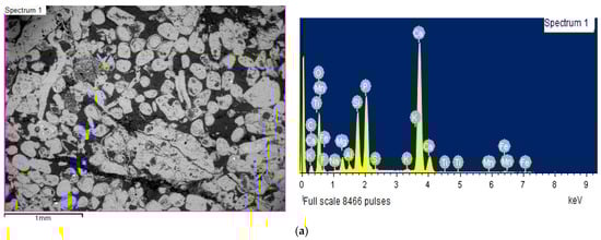 Enlarged electronic image of the microstructure and the content of elements in the structure of the phosphorite ore fines, wt.% (at points “Spectrum 1, 2, 4, 5, 6”). (a) Microstructure and elemental composition of the phosphorite ore fines (“Spectrum 1”). (b) Microstructure and elemental composition of the phosphorite ore fines (“Spectrum 4”). (c) Microstructure and elemental composition of the phosphorite ore fines (“Spectrum 5”). (d) Microstructure and elemental composition of the phosphorite ore fines (“Spectrum 6”). (e) Microstructure and elemental composition of the phosphorite ore fines (“Spectrum 2”).