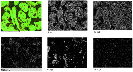Electron microscopic studies of the distribution of the main chemical elements P, Ca, Mg, Si, F using energy dispersion X-ray spectroscopy in the mapping mode showed the predominant presence of fluorine-containing calcium phosphate, with dolomite and quartz also in close germination (Figure 6).