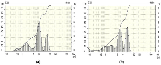 The analysis of dispersed composition and size of milled particles of mechanoactivated phosphorite flour was carried out on a “Analizette 22” laser analyzer of “MicroTec Fritsch GmbH” (Germany). The results of the study compared to the non-activated phosphorite flour ground in a conventional ball mill are presented in Figure 7.