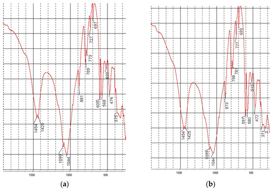 The assignment of the IR band is confirmed in the authors’ work [44], in which the Ichang (China) were studied using infrared spectroscopy. Infrared spectroscopy was carried out in the spectral band of 450–4000 cm−1 using on device Perkin-Elmer-FT-1730 (Waltham, MA, USA).