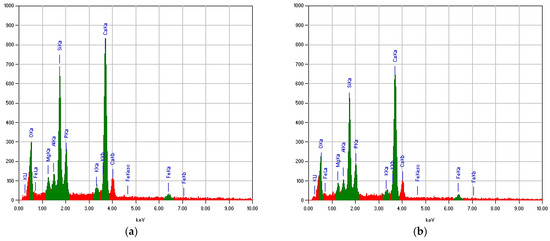 Samples of non-activated and mechanoactivated phosphorite flour were studied using energy-dispersive X-ray spectroscopy (Figure 9). Intense secondary X-ray signals inherent in Ca, Si, O, P, Mg, Al elements are observed on the energy dispersion spectrum of the non-activated phosphorite flour (Figure 9a). The energy dispersion spectrum of mechanically activated phosphorite flour (Figure 9b) shows a significant decrease in the intensity of secondary X-ray signals, which, in our opinion, indicates a corresponding decrease in the content of minerals in crystalline form in which the elements Ca, Si, O, P, Mg, Al are present.