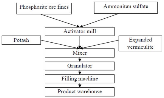 The performed investigation results became the basis for the development of a technological scheme for the production of composite nitrogen–phosphorus–potassium containing NPK fertilizers, using also expanded vermiculite to ensure a prolonged action of the resulting fertilizers (Figure 13).