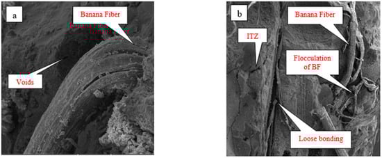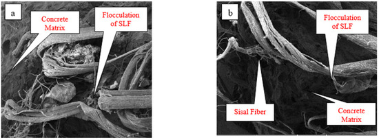 - The micromorphology of the samples with SLF and BF revealed loosely bonded connections between the fibers and the matrix, which contributed to the degradation of the concrete’s strength properties. The adhesive strength between the fibers and the cement matrix was significantly lower than that of the control sample due to the weak cohesive strength between fibers and concrete.