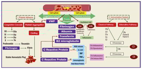 Additionally, complement pathway components, specifically C3a and C5a, can be triggered by antigen–antibody complexes or bound C-reactive protein (CRP) and bind to the membrane as presented in Figure 1 [42,43,44]. This reaction is caused by proinflammatory cytokines, such as Interleukin-1β (IL-1β), Tumor necrosis factor-α (TNF-α), and Interleukin-6 (IL-6), and involves the interaction between different receptors and ligands on the leukocytes. Activated leukocytes can also release reactive oxygen species (ROS), which are overproduced in HD patients. This is catalyzed by 5-Lipoxygenase (5-LO), which leads to ROS formation and the release of lipoxins and leukotrienes. Activation of the 5-lipoxygenase pathways has been observed in uremia and HD. Heat shock proteins (Hsp70) can also play a role in inflammation [45]. Hsp70 can act as molecular chaperones and cytokines and intervene in antigen processing and presentation. Recent studies have shown that Hsp70 has high binding capabilities in relation to artificial surfaces, such as the dialysis membrane. Figure 1 illustrates the primary reactions that occur in blood due to biomaterial surfaces, with a focus on protein adsorption, cell rupture, complement system activation, and coagulation pathways. The fibrin network that forms as a result of coagulation pathway activation is also depicted. Additionally, the figure highlights the appearance of complement proteins on the biomaterial interface, indicating both the classical and alternative complement pathways. The eicosanoid biosynthesis pathways from arachidonic acid are also shown, with the involvement of various coagulation factors, interleukins, interferons, immunoglobulin G, lipoxygenase, and cyclooxygenase.