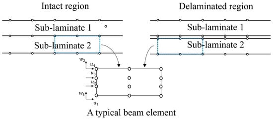 The utilization of the surface displacements in HOM provides ease in modeling delamination, which is shown in Figure 3. For the contact region, the adjunct sub-laminate/element is directly connected in the thickness direction by taking the nodes at the bottom surface of the upper sub-laminate and nodes at the top surface of the lower sub-laminate as common nodes. As for the delaminated region, these common nodes are separated into two sets of nodes without physical gaps so that the continuity of displacements is relaxed in this region. The figure also presents a typical beam element, where unknowns are taken at four reference planes; thus, four nodes are taken along the thickness direction. This model was implemented by developing a beam element where 3 nodes are taken along the axial direction. It should be noted that the 2D strain was decoupled into x (axial) and z (thickness direction) separately (see Equations (4)–(6)). Thus, the finite element interpolation was only applied to the one-dimension strain in terms of x (see Equations (6)–(8)). The integration along z direction was separately performed by using Gauss quadrature integration (see Equations (18) and (19)).