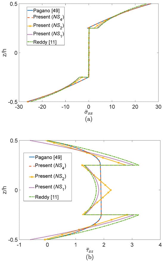 Through-thickness variation of (a) , and (b) for the symmetrical composite beams predicted at the beam midspan by different models [11,49].