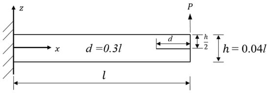 A composite beam with a delamination was analyzed to assess the performance of the HOM-based model in simulating delamination. A delaminated symmetrical layered composite beam [0/90/0/90]s was considered. One end of the beam was fixed, and a mid-plane delamination was inserted at the other end where a point load was acting on the beam top (see Figure 5). The same material properties utilized for the equal-thickness plies in Section 3.1 were also used in this section.