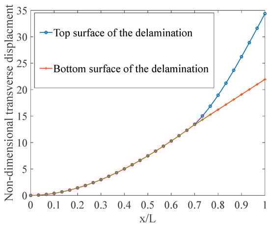 The present model with three sub-lamination schemes (NS2,NS4,NS8) was used to simulate the beam and the results are shown in Table 4. This table presents transverse displacements (w) and axial displacements (u) () predicted at four different points: 1, beam top; 2, surface above the delamination; 3, surface below the delamination; and 4, beam bottom at the beam free end. Equations and were used to nondimensionalize these results. The value in this table shows that the surface above the delamination had a larger deflection than that below the delamination, which is an indicator of the opening of the delamination. For better visualization, the through-beam length variation of deflection at two sides of the delamination was predicted and plotted in Figure 6.