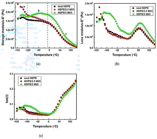Figure 3. The storage modulus (a), loss modulus (b), and tan (δ) values (c) of HDPE nanocomposites reinforced by graphene nanoplatelets (GNPs) with an average platelet diameter of 25 μm (M25), containing 2.5 wt.% and 5 wt.% GNPs. Adopted with permission from ref. [41].