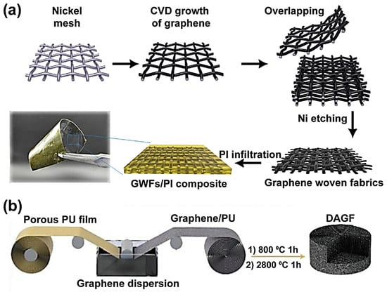 Figure 4. (a) Preparation process of GWFs/PI composite films and (b) preparation of dual-assembled graphene framework (DAGF) and composites by rolling process. Reprinted with permission from refs. [57,58].